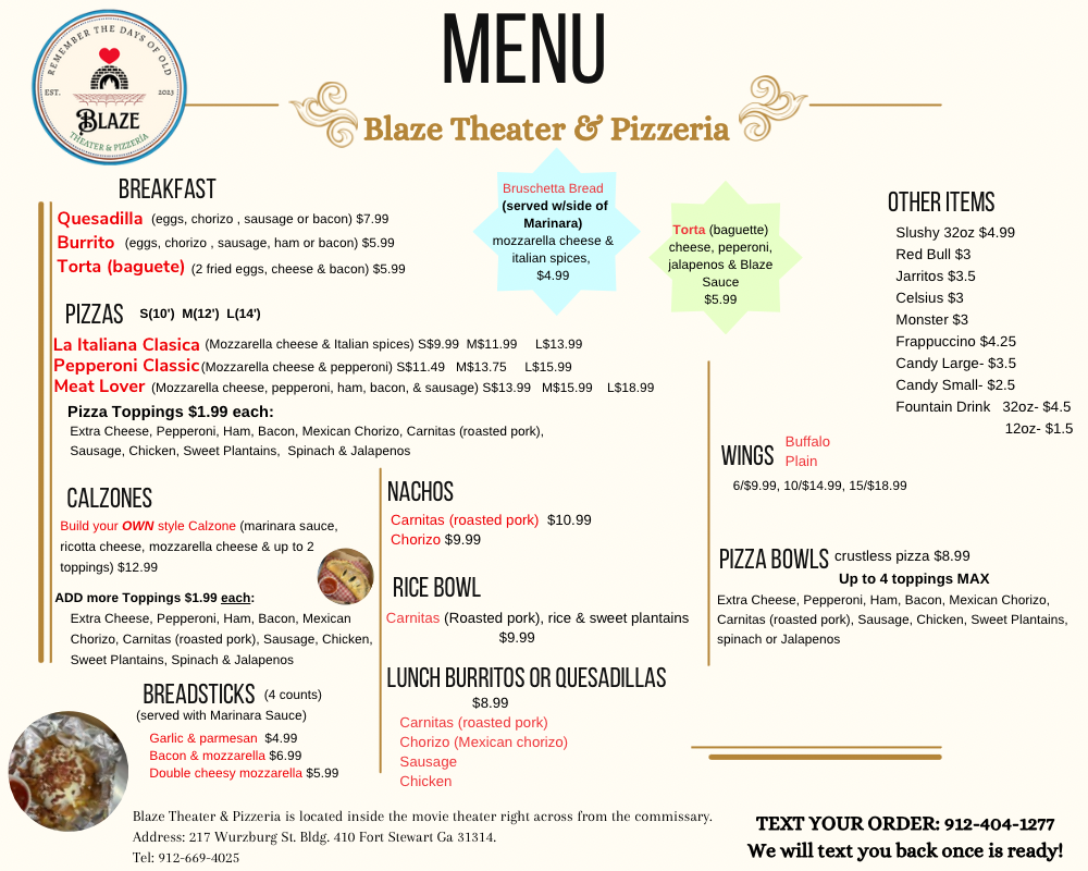 Welcome to Blaze Theater & Pizzeria, located at 217 Wurzburg St, Fort Stewart, GA! This vibrant venue seamlessly combines the excitement of cinema with the deliciousness of freshly-made pizzas.